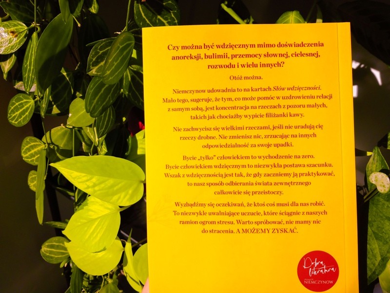 Jeśli jeszcze nie znacie potęgi wdzięczności, nie doświadczyliście jej niezwykłej mocy, ta książka może być dla was pewnego rodzaju drogowskazem, wyznaczającym kierunek, w jakim warto podążać. Jednak momentami możecie też poczuć się nieco przytłoczeni, czy nawet lekko zirytowani. Niepostrzeżenie Anna H. Niemczynow przechodzi bowiem od lekkich sugestii dotyczących praktykowania wdzięczności do moralizatorskich tonów, uderzając o narrację wszechwiedzącej. Im bardziej zagłębiałam się w książkę, tym częściej miałam wrażenie, że coraz więcej tam o samej autorce, podającej jedyne słuszne rozwiązania pewnych kwestii i stawiającej siebie jako wzór postępowania, a coraz mniej o samej wdzięczności.